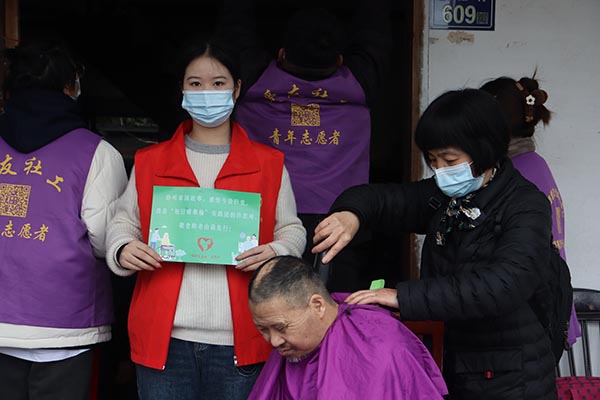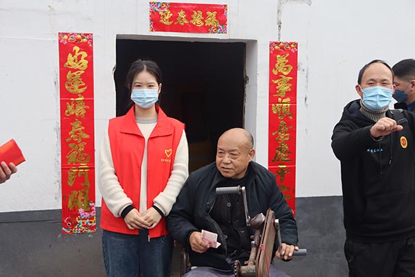 經(jīng)團(tuán)隊(duì)成員與鄭老人閑暇聊天之后,我們了解到:鄭老人是在一次交通事故中意外受到了不可逆的損傷,導(dǎo)致他雙腿不能像常人般自如行動(dòng),同時(shí)他還存在多項(xiàng)中老年人基礎(chǔ)性疾病。在清楚了老人的情況后,“旭日暖桑榆”成員不免對(duì)此感到同情,因此大家便更迫切地想為老人家中盡上自己一份綿薄之力。團(tuán)隊(duì)成員在老人家中為其收拾床榻、灶臺(tái),清洗了留置于水臺(tái)上的鍋碗瓢盆,打掃了地面,昏暗的一隅房間在團(tuán)隊(duì)與組織的努力下逐漸地變得亮堂起來。屋里的忙碌更比不上屋外的熱鬧,愛友社工服務(wù)中心正派專人為鄭老人理頭,鄭老人不禁喜笑顏開。志愿大學(xué)生們更沒有閑著,紛紛為增添老人家中的年味而出力,大家撕下舊春聯(lián)換上新春聯(lián),將老人的屋檐、墻角、院前都打理了一番,正為準(zhǔn)備迎接新一年的到來。隨后我們還對(duì)鄭老人進(jìn)行量血壓、測溫等基礎(chǔ)性身體檢查,并為老人送上新年紅包。