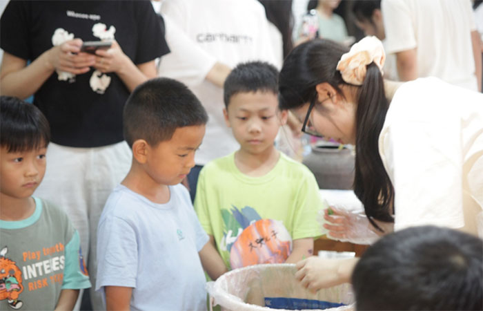 漆扇課程中,隊員通過展示PPT圖文和播放紀錄片的方式,在線上線下講述漆扇2000多年歷史及天然大漆的提取過程。在體驗環節,線下親子自由發揮,在扇面上題字作畫,隨后實踐隊員指導小朋友調配環保漆料為扇面染色,深淺不一的色彩在水中暈染后,使得原本素白的扇面變得五彩斑斕;線上則以特寫鏡頭聚焦調色、暈染細節,不少網友留言“學會了配色技巧”。當扇面成品誕生時,線上線下贊嘆聲交織。
