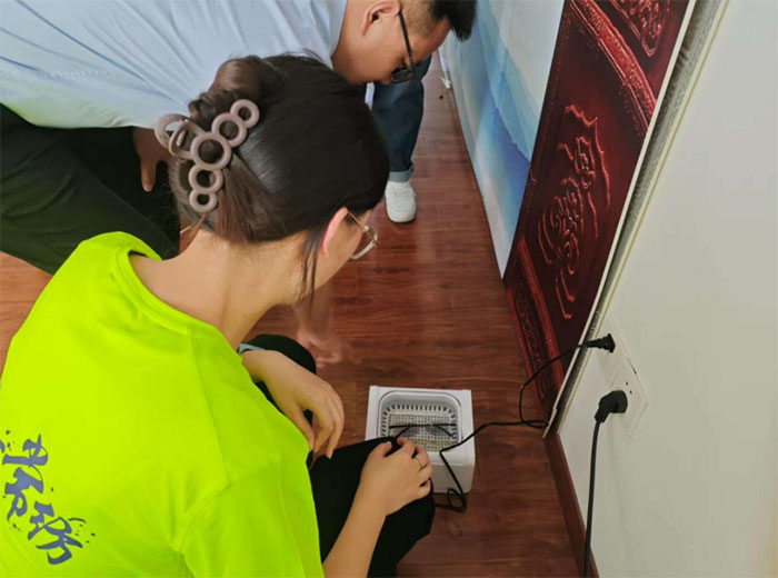 實踐團成員在使用眼鏡清洗機為老人清洗眼鏡