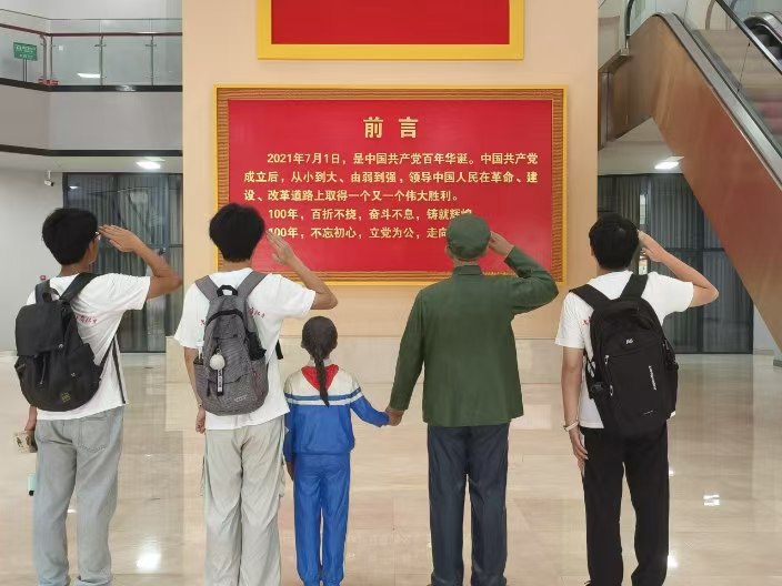 圖為實踐隊隊員面向紅色“前言”展板整齊敬禮。 曹星宇供圖