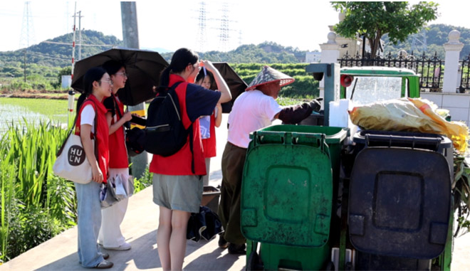 在走訪過程中,團隊成員在田間路上與垃圾回收人員攀談,了解到智能垃圾分類的運行機制。垃圾回收員介紹道:“我們村早晚收兩次垃圾,村民都很自覺,既方便又高效。”他還補充說,村子實行‘四定一撤’,每個垃圾桶都有二維碼,掃描后能自動記錄垃圾重量并計入積分。