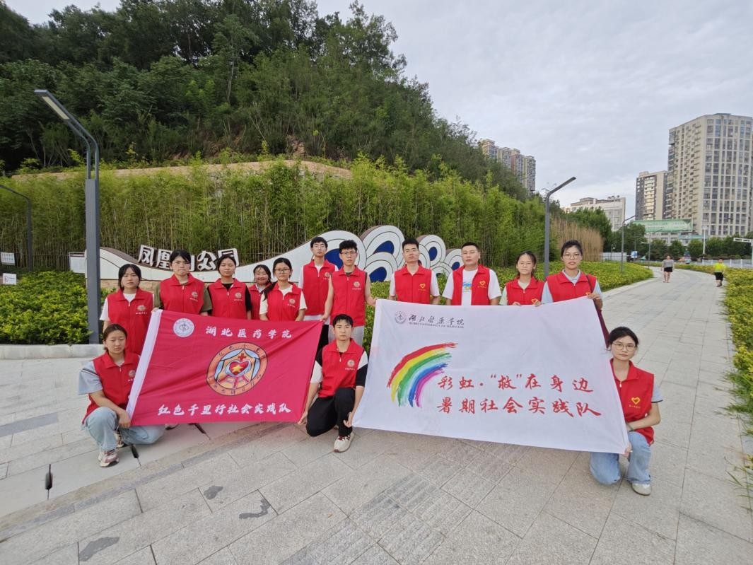 圖為紅色千里行與彩虹·“救”在身邊暑期社會實踐隊在鳳凰山公園前合影場景