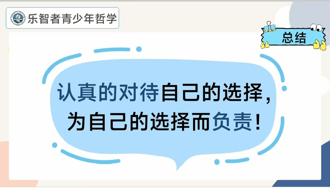 在課堂的最后,范老師將同學們從哲學思考拉回到日常生活之中,通過一則校園霸凌實例告訴同學們,袖手旁觀并不是正確的選擇,只有正視并承擔自己的責任才能做出正確的選擇。“認真對待自己的選擇,為自己的選擇而負責。