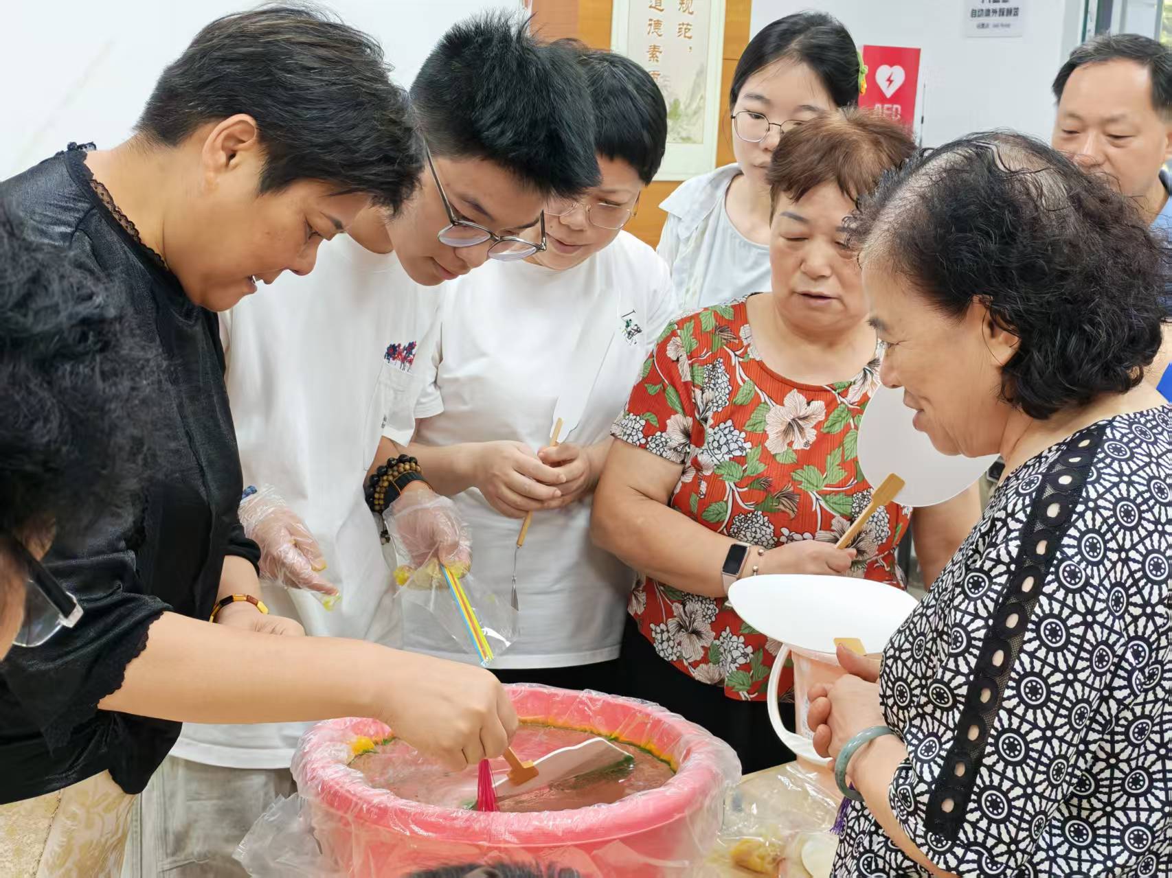 隨后,志愿者現場演示調漆過程。他拿出幾種不同顏色的漆料,向大家展示,然后取來一個水盆,開始將不同顏色的漆料按比例滴入。“調漆的比例很關鍵,不同的比例會調出不同的顏色效果。” 志愿者一邊操作,一邊向居民們講解。居民們不時就漆扇制作的細節向志愿者提問,“志愿者,調漆的時候需要注意什么呀?”“漆扇做好后,要多久才能干呢?” 志愿者都一一耐心解答。