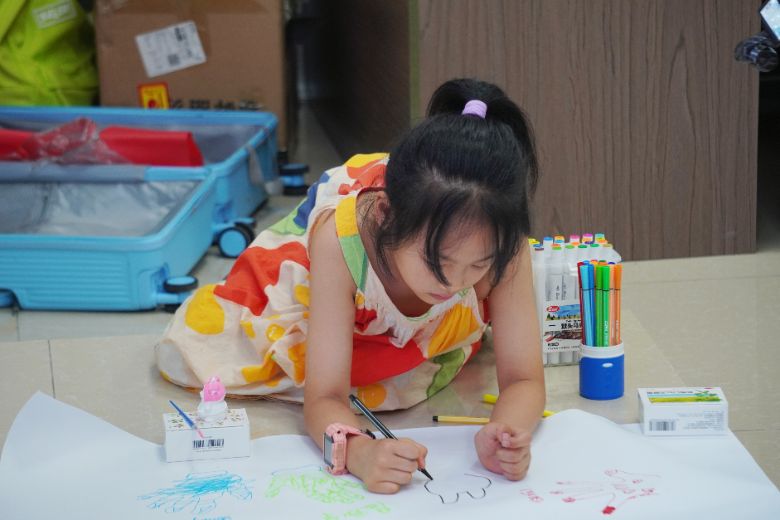 開班儀式上,22名社區(qū)兒童用五彩斑斕的手掌印完成專屬簽到,詳細的課程安排與特色介紹后,志愿者通過“蘿卜蹲”“時間膠囊”等破冰游戲,迅速拉近與兒童之間的距離,當日課程在一片歡聲笑語中徐徐展開。
