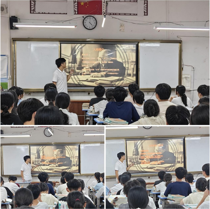 (圖為團(tuán)隊(duì)成員為亞山一中的同學(xué)們講述王力先生的精神)