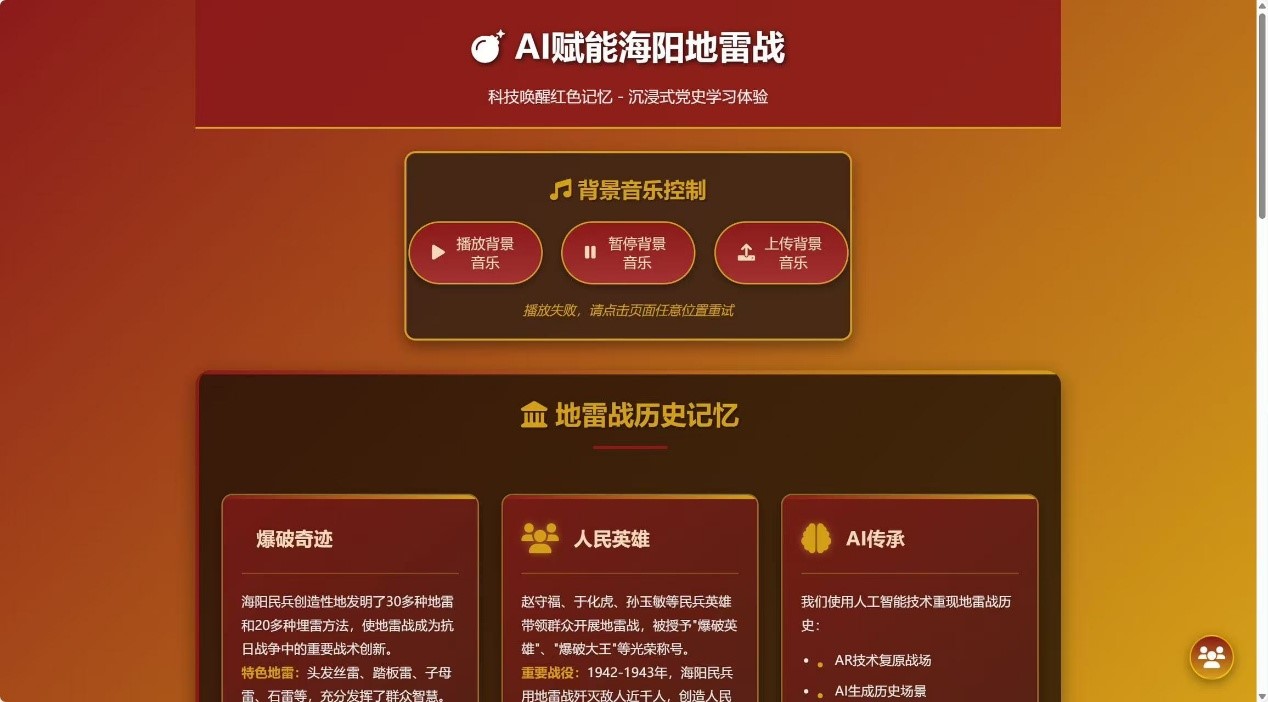 從紀念館返程,實踐團便錨定“AI賦能紅色傳承”方向全力攻堅。歷經日夜打磨,8月上旬,“AI賦能海陽地雷戰”主題網頁正式上線。進入網頁,背景音樂模塊靈動可控,播放、暫停、自定義上傳,用旋律為歷史敘事鋪陳沉浸底色;“地雷戰歷史記憶”板塊,“爆破奇跡”細數30余種地雷、20多類埋雷技法的創新火花,“人民英雄”深情鐫刻趙守福等先烈事跡,讓沉睡史料“活”成可感可知的立體故事 。