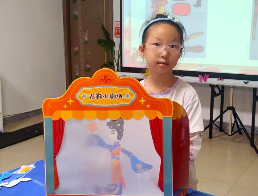 隨后,活動(dòng)進(jìn)入了實(shí)踐體驗(yàn)環(huán)節(jié)。志愿者們根據(jù)當(dāng)?shù)匚幕厣妥陨韺I(yè)特長(zhǎng),開設(shè)了多個(gè)非遺工坊課堂:“巧手生花”剪紙工坊里,紅紙?jiān)谥讣庹郫B翻轉(zhuǎn),銀剪穿梭間,孩子們從最簡(jiǎn)單的窗花學(xué)起,漸漸能剪出靈動(dòng)的動(dòng)物與繁復(fù)的花卉;一幅幅稚嫩卻充滿童趣的作品在他們手中誕生,喜悅?cè)绱宏?yáng)般漾開在每個(gè)孩子的臉上。隨后,“光影傳奇”皮影工坊點(diǎn)亮了想象的世界:志愿者們演示皮影操作之后,孩子們分組協(xié)作,為皮影涂抹絢爛色彩,親手操縱人物演繹《孫悟空三打白骨精》的經(jīng)典片段——白色幕布上光影搖曳,古老故事煥發(fā)出嶄新的活力。