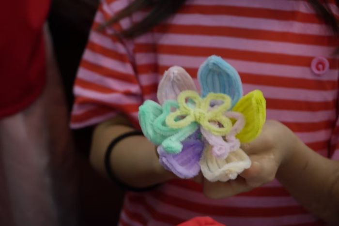 在扭扭棒活動環節,色彩繽紛的扭扭棒成了孩子們手中的“魔法道具”。他們的小手靈活舞動,時而彎曲,時而纏繞,專注神情仿佛在施展神奇魔法。每一個作品都獨一無二,充滿天馬行空的創意。孩子們在創作過程中,不僅鍛煉了動手能力,更激發了無限想象力。志愿者們積極融入其中,與孩子們并肩作戰。當遇到復雜操作,孩子們手足無措時,志愿者們及時伸出援手,耐心輔助他們完成。一件件“大作”順利完成后,孩子和志愿者臉上都洋溢著滿滿的成就感,孩子們更是擁有了屬于自己的心儀作品,這份喜悅在空氣中久久彌漫。
